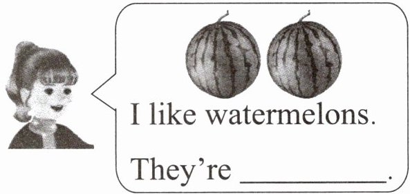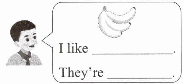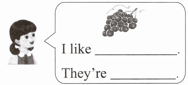 Chen Jie,Wu Binbin 和 Sarah 正在讨论他们喜欢的水果和水果的颜色。看图,选词填空。