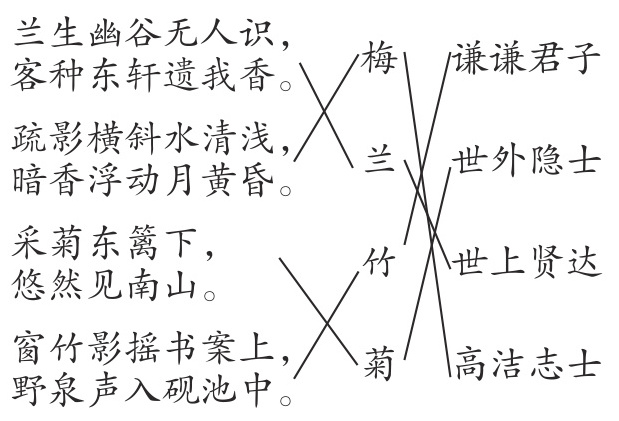 梅、兰、竹、菊“四君子”,千百年来以其清雅淡泊的品质,一直为世人所钟爱,成为一种人格品性的文化象征。猜猜下面诗句分别写的是什么,它们又被后人赋予了哪些象征意义,然后连一连。