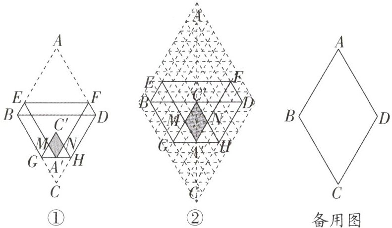 ∴AB = BC = AD = CD = 8,∠ABC = ∠ADC = 180° - 60° = 120°,AB//CD,AD//BC.根据题意得∠MA'N = ∠C' = 60°.把菱形纸片ABCD放在菱形网格中(图中每个小三角形都是边长为1的等边三角形),点A,B,C,D,E恰好落在网格图中的格点上,