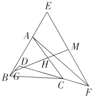 变式 1 如图,在$\triangle ABC$中,$D是\triangle ABC$内的一点,延长$BA至点E$,延长$DC至点F$,使得$AE = CF$,$G$,$H$,$M分别为BD$,$AC$,$EF$的中点,如果$G$,$H$,$M$三点共线,求证:$AB = CD$。