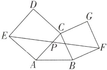 例3 梯形中位线问题:如图,分别以 $\triangle ABC$ 的边 $AC$,$BC$ 为一边,在 $\triangle ABC$ 外作正方形 $ACDE$ 和正方形 $CBFG$,连接 $EF$,$P$ 是 $EF$ 的中点,求证:点 $P$ 到 $AB$ 的距离是 $AB$ 的一半。