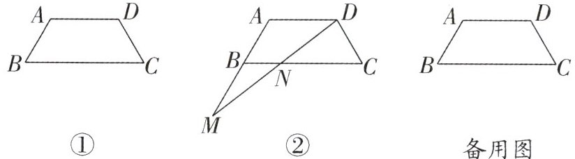 ① 当点 $M$ 在线段 $AB$ 的延长线上时(如图②),设 $BM = x$,$DM = y$,求 $y$ 关于 $x$ 的函数表达式并写出 $x$ 的取值范围;