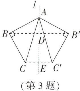 3. 如图,△ABC与△AB'C'关于直线l对称,连接对称点B和B',C和C',分别交l于点D,E,已知∠ABC = 90°,AB = BC,若BB' = 14,CC' = 8,则AE的长为
