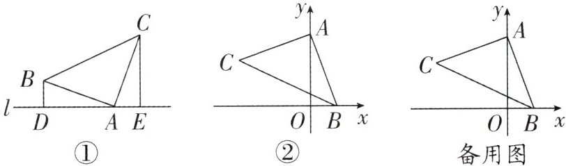 点拨 (1)根据 $AAS$ 可证明 $\triangle ABD\cong\triangle CAE$;(2)过点 $C$ 作 $CD\perp y$ 轴,垂足为 $D$,证明 $\triangle AOB\cong\triangle CDA$,由全等三角形的性质即可得出答案;(3)分三种情况,由全等三角形的性质得出答案.