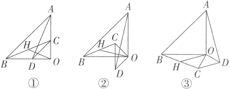 点拨 (1)只要证明 $\triangle AOD\cong\triangle BOC(SAS)$,即可解决问题;(2)延长 $OH$ 到点 $E$,使得 $HE = OH$,连接 $BE$,证明 $\triangle BEH\cong\triangle COH(SAS)$,再证明 $\triangle BEO\cong\triangle ODA(SAS)$ 即可解决问题;(3)延长 $OH$ 到点 $M$,使得 $HM = OH$,连接 $BM$,证明 $\triangle BMH\cong\triangle COH(SAS)$,得出 $BM = OC$,利用三角形的三边关系即可解决问题.