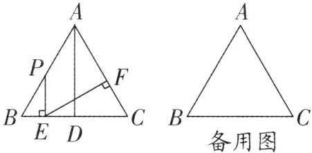 变式 2 如图,在等边三角形 $ABC$ 中,$AD \perp BC$ 于点 $D$,$P$ 是 $AB$ 边上任意一点(点 $P$ 可以与点 $A$ 重合,但不与点 $B$ 重合),过点 $P$ 作 $PE \perp BC$,垂足为 $E$,过点 $E$ 作 $EF \perp AC$,垂足为 $F$。