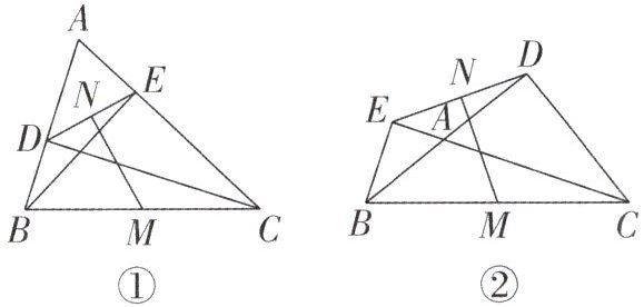 例 2 如图①,已知锐角三角形 $ ABC $ 中,$ CD $,$ BE $ 分别是 $ AB $,$ AC $ 边上的高,$ M $,$ N $ 分别是线段 $ BC $,$ DE $ 的中点。