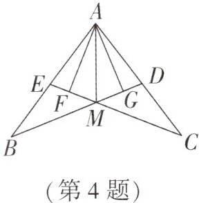 4 如图,已知 $AB = AC$,点 $D$,$E$ 分别在 $AC$,$AB$ 上且 $AE = AD$,连接 $EC$,$BD$,$EC$ 交 $BD$ 于点 $M$,连接 $AM$,过点 $A$ 分别作 $AF\perp CE$,$AG\perp BD$,垂足分别为 $F$,$G$,下列结论: