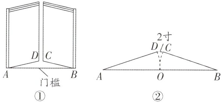3. 《九章算术》是古代东方数学代表作,书中记载:今有开门去阃(读 kǔn,门槛的意思)一尺,不合二寸,问门广几何?题目大意是:如图①,②(图②为图①的平面示意图),推开双门,双门间隙 $CD$ 的距离为 $2$ 寸,点 $C$ 和点 $D$ 距离门槛 $AB$ 都为 $1$ 尺($1$ 尺 $= 10$ 寸),则 $AB$ 的长是