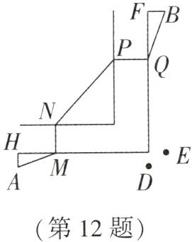 12. (襄阳自主招生)如图,有一条直角弯道河流,河宽为 2,$A$,$B$两地到河岸边的距离均为 1,$AH = BF = 1$,$AD = 7$,$BE = 9$,现欲在河道上架两座桥$MN$,$PQ$,使$AM + MN + NP + PQ + QB$最小,则最小值为(