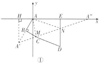 (1)如图①,连接AB,则直线AB交x轴于点P,设$P(x,0)$,过A,B两点的直线为$y=kx+b(k\neq0)$,则$\begin{cases}3 = k + b\\-2 = 5k + b\end{cases}$,解得$\begin{cases}k = -\frac{5}{4}\\b = \frac{17}{4}\end{cases}$,故过A,B两点的一次函数的表达式为$y=-\frac{5}{4}x+\frac{17}{4}$,把点$P(x,0)$代入一次函数的表达式得$-\frac{5}{4}x+\frac{17}{4}=0$,解得$x=\frac{17}{5}$,故点P的坐标为$(\frac{17}{5},0)$。
