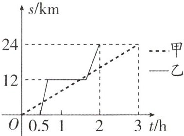 1. 甲、乙两位同学沿同一路线从 $ A $ 地出发前往 $ B $ 地,甲、乙分别以不同的速度匀速前行.乙比甲晚 $ 0.5h $ 出发,并且在中途停留 $ 1h $ 后,按原来速度的一半继续前进.此过程中,甲、乙两人离 $ A $ 地的路程 $ s(km) $ 与甲出发的时间 $ t(h) $ 之间的关系如图.下列说法:① $ A $,$ B $ 两地相距 $ 24km $;②甲比乙晚到 $ B $ 地 $ 1h $;③乙从 $ A $ 地刚出发时的速度为 $ 72km/h $;④乙出发 $ \frac{17}{14}h $ 与甲第三次相遇.其中正确的有 (