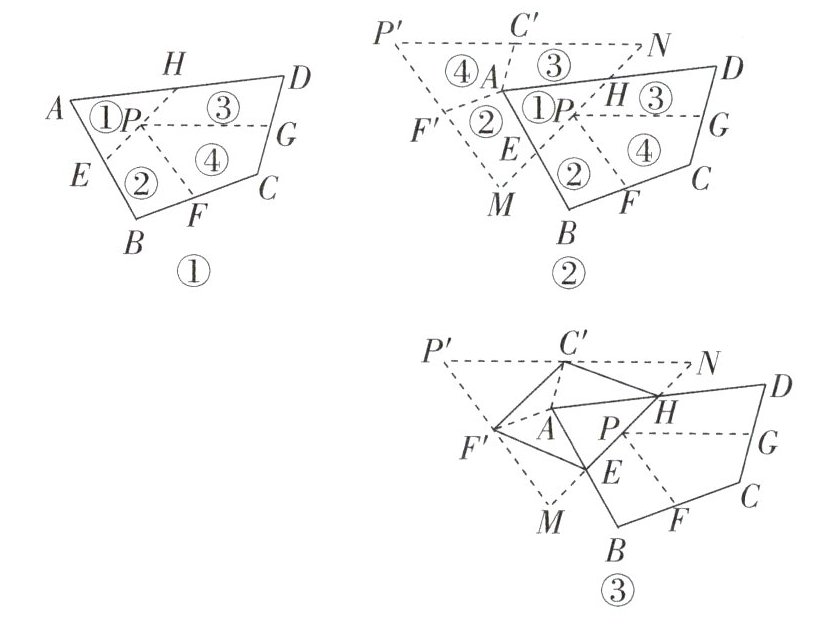 如图①,点 $ E $,$ F $,$ G $,$ H $ 分别是边 $ AB $,$ BC $,$ CD $,$ DA $ 的中点。连接 $ EH $,点 $ P $ 是线段 $ EH $ 的中点,连接 $ PF $,$ PG $。沿线段 $ EH $,$ PF $,$ PG $ 剪开,将四边形 $ ABCD $ 分成①,②,③,④四部分,按如图②所示的方式即可拼成一个无缝隙也不重叠的三角形 $ P'MN $。