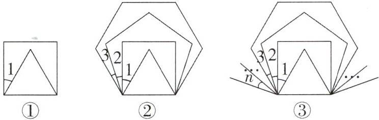 .(3)如图③,平面上,将边长相等的正三角形、正方形、正五边形、正六边形……正 $(n + 3)$ 边形的一边重合并叠在一起,每个正 $(k + 3)$ 边形与正 $(k + 2)$ 边形的重合边的同一侧的邻边的夹角为 $\angle k$,试说明 $\angle1-\angle2+\angle3-\angle4+…+\angle(n - 1)-\angle n$ 的大小不会小于 $12^{\circ}$($n$ 是偶数).