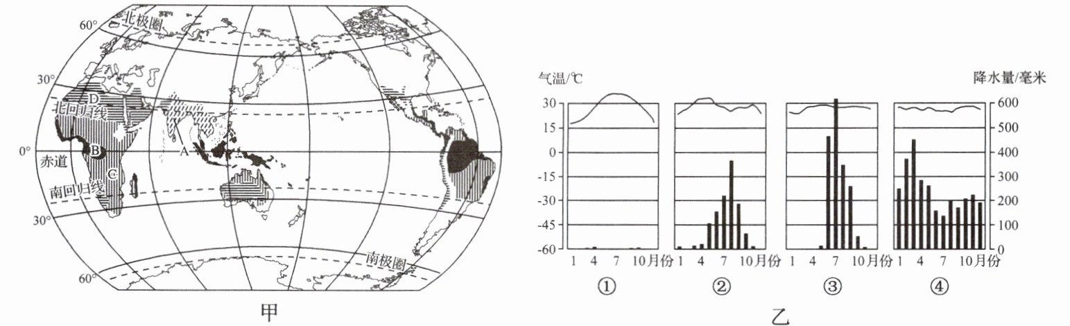 (3)判断图乙中①②③④四种气候类型与图甲中A、B、C、D四种气候类型的对应关系。______