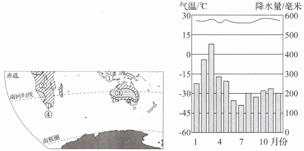 科学家综合各地气温和降水的特点,划分出不同的气候类型。下图是世界局部地区气候类型分布图和某地多年平均各月气温和降水量图。读图,完成1~2题。