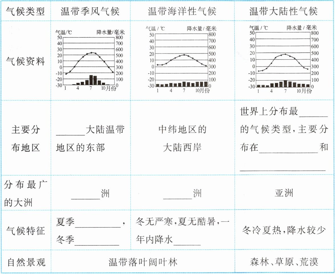 |气候特征|夏季____,冬季____|冬无严寒,夏无酷暑,一年内降水____|冬冷夏热,降水较少|