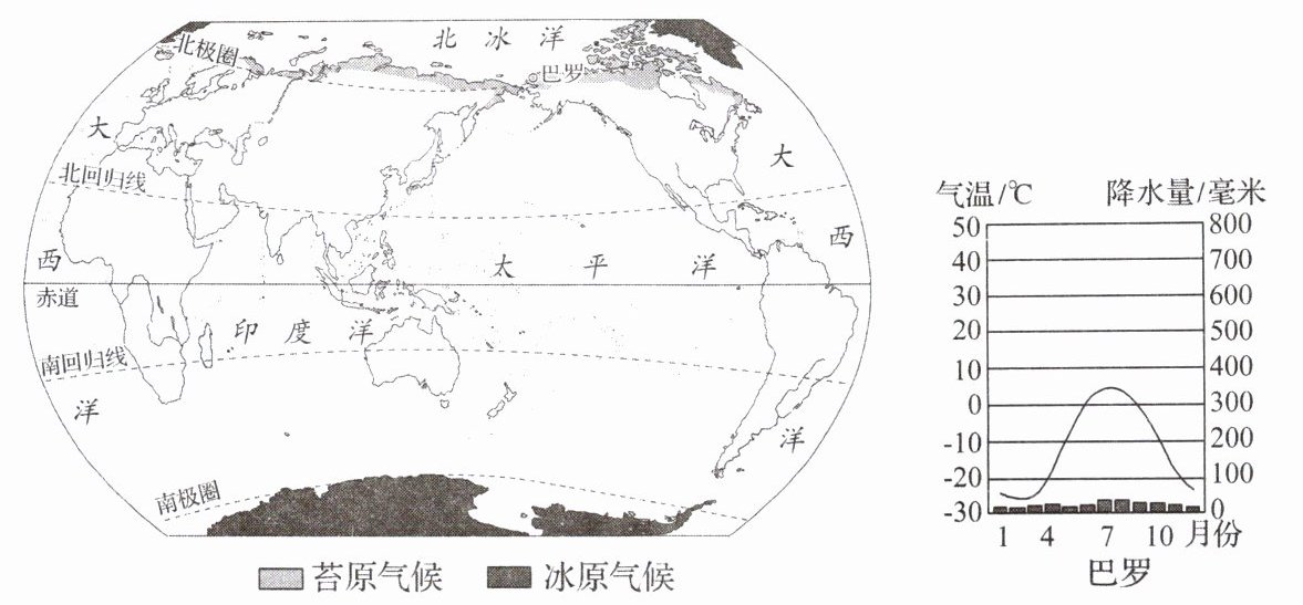 小组同学在老师的帮助下,了解到寒带气候主要分布在南、北极圈以内。下图为小组同学查阅到的寒带气候分布图和巴罗气温年变化曲线和逐月降水量图。读图,完成4~6题。