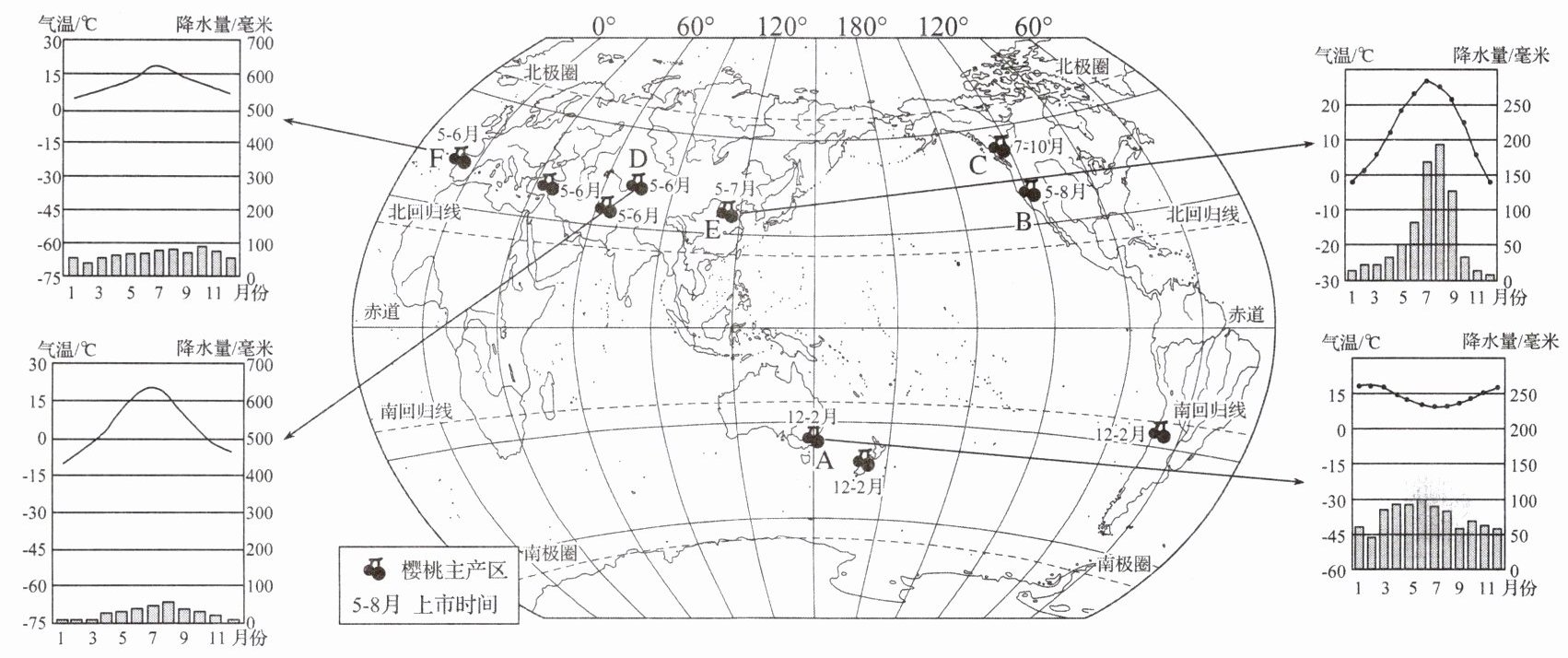 (2)E、F两地同为樱桃产区,气候存在一定差异。E地的气候特征是____。