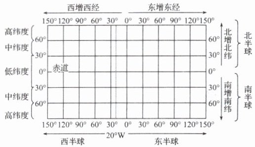 |经纬度的判断|向北度数增加为____,向南度数增加为____;向东度数增加为____,向西度数增加为____|图示箭头是地球自转方向,逆(顺)时针中心是北(南)极点,图示纬度均为北(南)纬;从$0^{\circ}经线顺地球自转方向180^{\circ}$为东经,反之为西经|