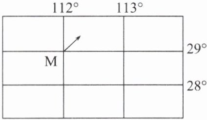 龙卷风是一种灾害性天气。某日,一场龙卷风突袭某地,小明根据天气预报将龙卷风始发地$M$及龙卷风的运动方向在经纬网地图中做了标注。