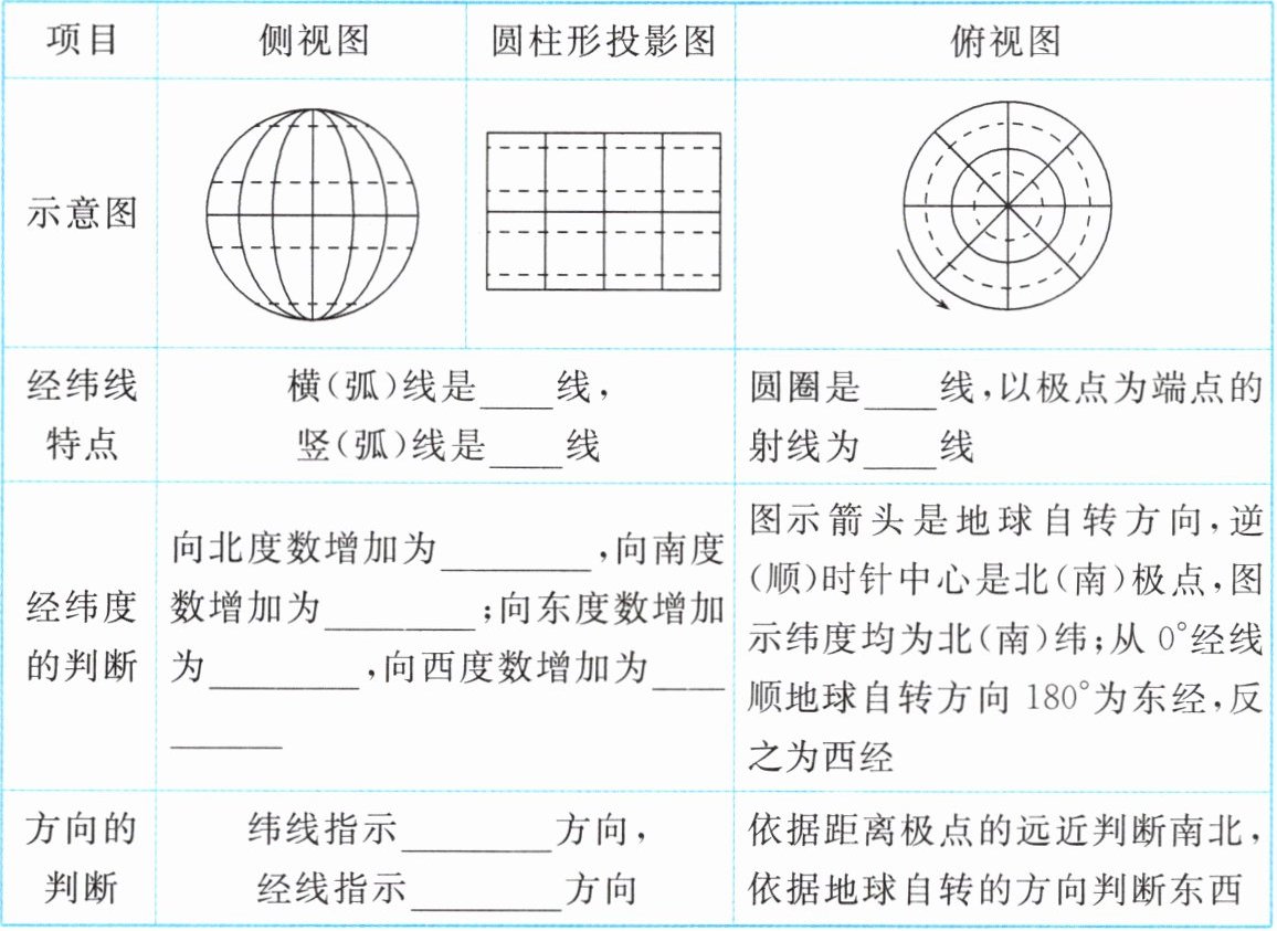 |经纬线特点|横(弧)线是____线,竖(弧)线是____线|圆圈是____线,以极点为端点的射线为____线|