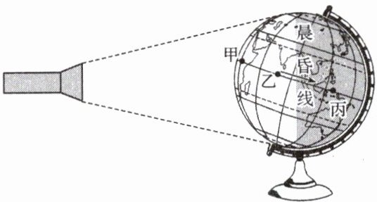 自西向东转动地球仪,图中乙、丙两地,即将由白昼进入黑夜的是____地,该地的李霞同学即将看到太阳____(选填“东升”或“西落”),她的____(选填“早餐”或“晚餐”)时间快到了。同一地方的人,每天经历着清晨—正午—傍晚—子夜—清晨的连续变化,即____现象。
