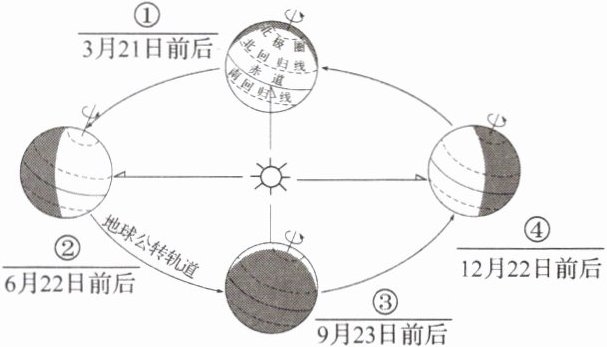 (1)(由左至右,由上至下)春分 赤道 昼夜等长 夏至 北回归线 秋分 冬至 昼最短,夜最长
