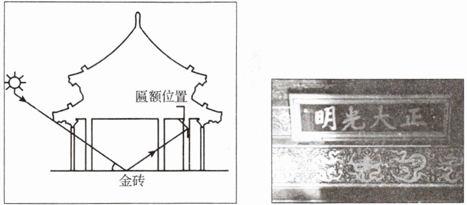 (2024·东营模拟)2023年12月22日,北京故宫乾清宫“正大光明”匾额被“点亮”,吸引了众多游客参观。“正大光明”匾额被“点亮”的原因是太阳光照射到乾清宫殿内的金砖上,经过反射“点亮”了匾额。读图,完成8~9题。