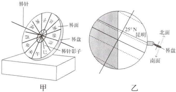 (3)图乙所示昆明当天的节气是______,此时晷针的影子会投射在晷盘的______面。三个月后,昆明日晷能够观测使用的时间将会变______。