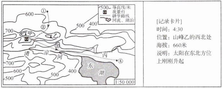 (2024·临沂学业考)我国北方东部沿海地区某中学学生到学校附近的西山进行研学旅行。下图为西山及其附近等高线示意图和研学记录卡片。读图,完成8~9题。