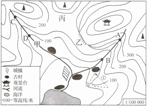 (3)AB 等高线更密集,坡度更陡 自西北往东南