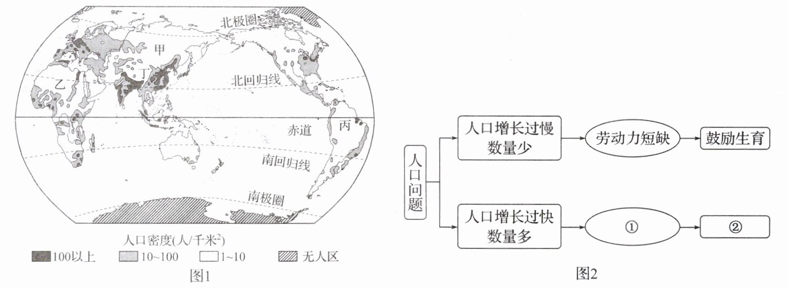 某中学地理兴趣小组利用世界人口分布图(图1)和人口问题图(图2)开展关于世界人口的探究
