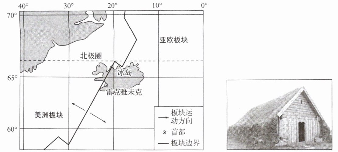 (2024·惠州期末)草皮屋是冰岛的传统民居,其利用当地丰富的草皮资源作为屋顶和外墙材料,十分牢固且美观。如今草皮屋成为世界文化遗产,被改造成博物馆、酒店等。下图为冰岛位置与草皮屋景观图。读图,完成7~8题。