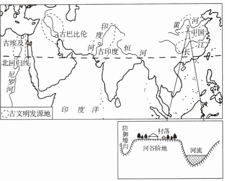 古村落是世界古文明的重要组成部分,大量古村落被发掘并加以保护,其中位于陕西省西安市东郊的半坡村落遗址是距今6800-6200年新石器时代的先民在河谷阶地上营建的居住场所。右图为世界古文明发源地及半坡原始村落分布图。读图,完成(1)~(2)题。