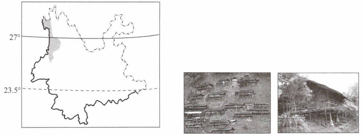 (2024·云南学业考)“千脚落地房”是云南省怒江地区的传统民居。房屋通常建在阳坡或靠山处,底部竖立几十根木桩,像千百只脚一样支撑着整个房屋,屋顶覆盖茅草,建房时尽量少动土石。读怒江傈僳族自治州位置示意图和“千脚落地房”实景图,完成3~4题。