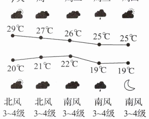 思考3:多云—阴—小雨—多云,北风转南风,最高气温逐渐降低。