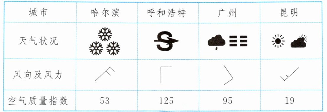 (2024·惠州期末)“回南天”是天气返潮现象,一般出现在二、三月份,主要是因为冷空气走后,暖湿气流迅速反攻,致使气温回升、空气湿度加大,这期间天气潮湿,有小雨或大雾。下表为我国四个城市某日的天气情况。据此完成 1~3 题。