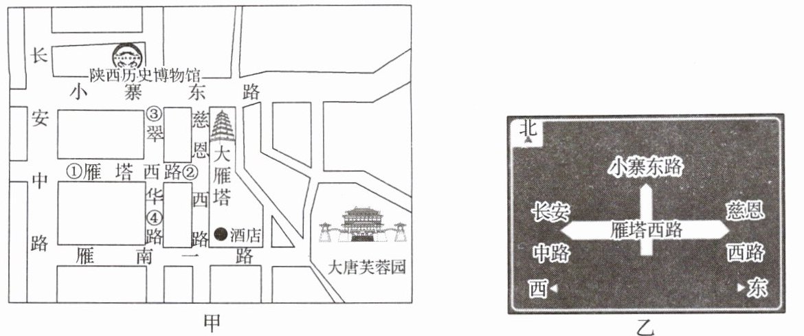 【典例 2】鄂尔多斯市某中学组织“探秘古都西安,穿越历史岁月”游学活动。游学行程为:酒店—陕西历史博物馆—大雁塔—大唐芙蓉园。图甲是游学景点分布图,图乙是某路牌指示图。读图,完成(1)~(2)题。