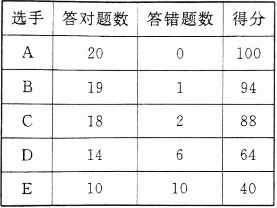 1. 下表记录了5位选手的答题情况.(有20道选择题,每道题分值相同,每题必答)