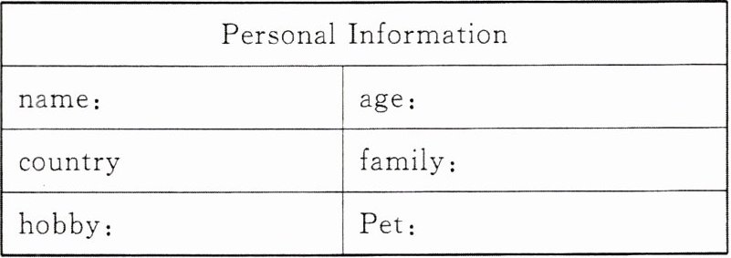 任务二:Becky Sharp; 11; the UK; 5 people; Play football; one tortoise and six goldfish