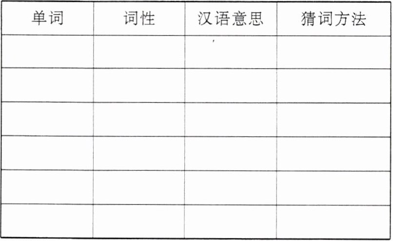 阅读文章,找出你不认识的单词填写在下面的表格中,你可能用到以下方法进行猜测生词。