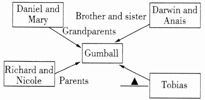 The first one is Gumball Watterson's family photo. Gumball is in the middle of the photo. Gumball's father Richard, his mother Nicole and his sister Anais are in the photo, too. Who is on the left of Gumball? He is Darwin. He is Gumball's brother. Daniel and Mary are Gumball's grandparents, but they are not in the photo.
