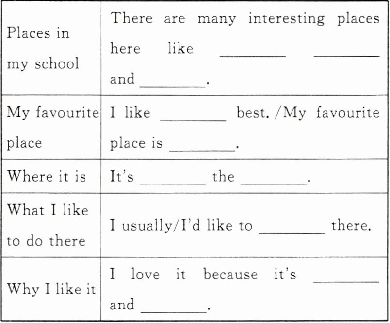 | My favourite place | I like the sports field best. /My favourite place is the sports field. |