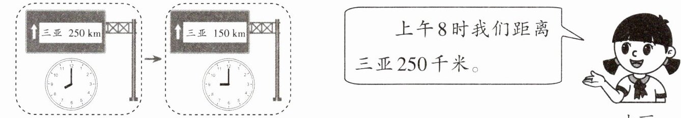 2. 周六上午,小丽全家开车去三亚,他们在不同的时刻分别在高速公路上看到这样两块路牌。照这样的速度,他们(