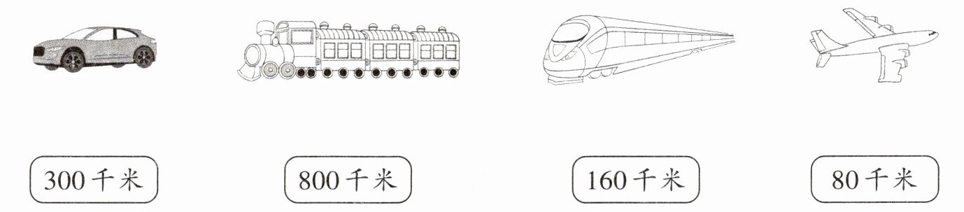 一、妙妙一家准备国庆节外出旅行,查询到可以选择自驾、特快列车、高铁和飞机四种交通方式,请你把这四种交通工具每小时可能行驶的路程连起来。