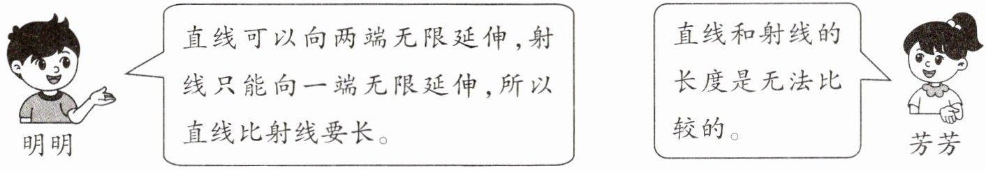 我赞同芳芳的说法。因为:直线没有端点,可向两端无限延伸;射线有一个端点,能向一端无限延伸。由于它们都能无限延伸,这就意味着它们的长度都不是确定的量,所以无法对直线和射线的长度进行比较,因此芳芳的说法正确。