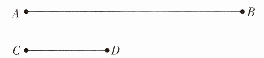 方法一:用圆规的两脚量出线段AB的长度,保持圆规两脚间的距离不变,再用圆规去量线段CD,若圆规一脚与C点重合,另一脚落在D点左侧,则AB<CD;若另一脚与D点重合,则AB=CD;若另一脚落在D点右侧,则AB>CD。