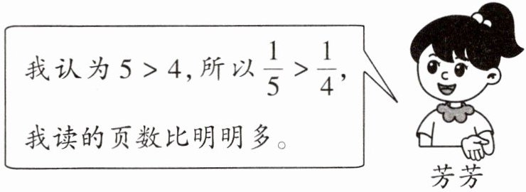芳芳的想法不对。理由:这两个分数的分子都是1,根据分数的比较方法:分子相同,分母越大分数反而越小。所以,$\frac{1}{5} < \frac{1}{4}$,明明读的页数比芳芳多。