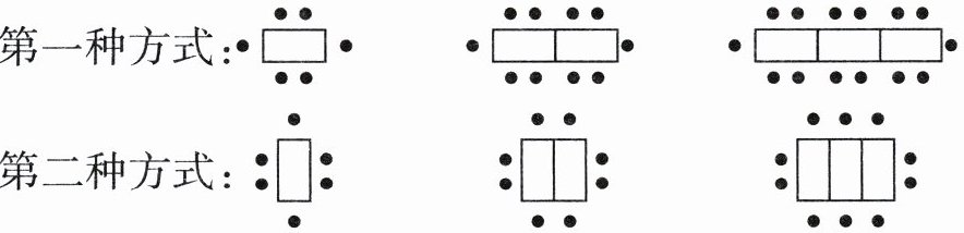 (3)第一种方式:30张桌子拼成10张大桌子可坐的人数为$ 10×(4×3+2)=140 $人,第二种方式:30张桌子拼成10张大桌子可坐的人数为$ 10×(2×3+4)=100 $人